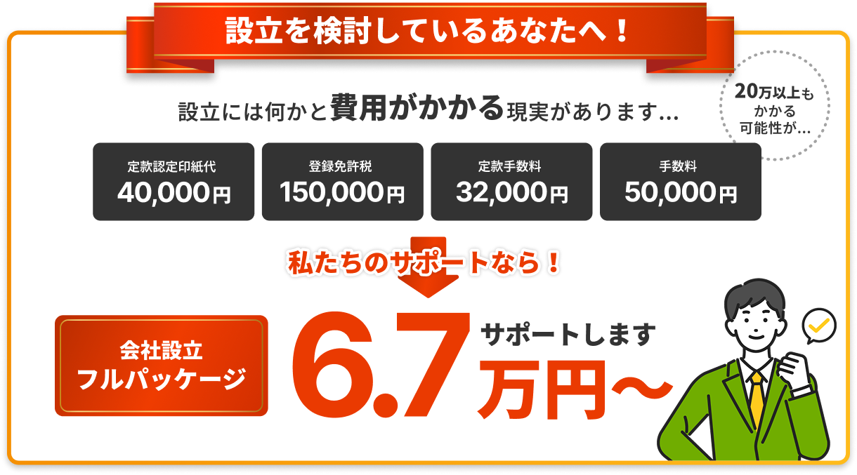 はい、本当です。トータルコストで安くなるケースがほとんどです。顧問契約を前提としていただきますが、ご自身で設立するより約14万円お安くなります。